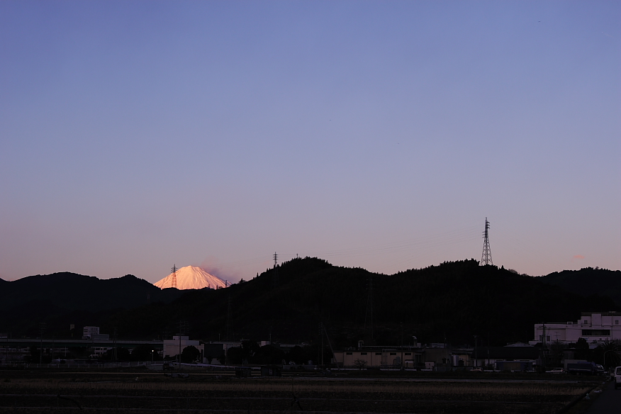 山の向こうにひょこんと頭を出した富士山。