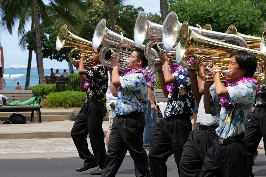 ただでさえ大変な吹奏楽を、常夏の島で、それも行進しながら演奏するのは非常に大変な事でしょうね。